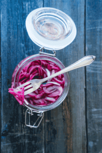 This very easy condiment adds zing but doesn’t also bring on a case of onion mouth. We use it sometimes in simplest form – onion and salt – and sometimes with lemon or lime juice.